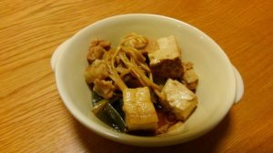 豚肉、焼き豆腐、えのき、ネギが具材です。