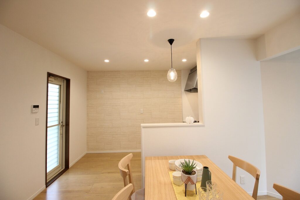 ダイニングの照明器具をダウンライトに。床とリビングドアは明るいベージュのカラーに変更しました。