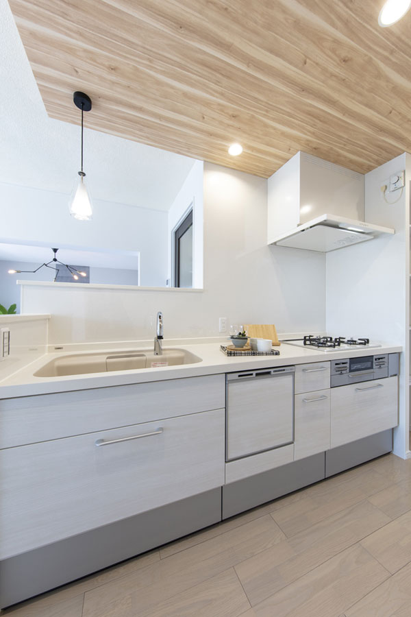 ホワイトカラーの対面式キッチンに全体をリフォームしました。自動水栓にし食洗機も取付け、使い勝手にもこだわりました。手元灯をペンダントにしたこともポイントです。